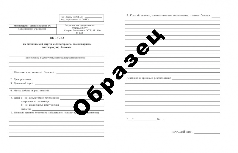 . При выписке из больничного отделения. Получение диплома международного образца и трудоустройство выпускников. Образец выписки вышлем на Ваш. ФОРМА ВЫПИСКИ ИЗ АМБУЛАТОРНОЙ КАРТЫ вариант для заполнения ВЫПИСКА ИЗ АМБУЛАТОРНОЙ КАРТЫ. Мне нужна выписка из амбулаторной карты для предоставления в центр переливания крови. Зачем страховая компания запросила выписку из амбулаторной карты за последние три года. Ситуация Для страховой компании для погашения кредита банка умершего брата требуется или выписка из амбулаторной карты или отказ поликлиники. Вам приятно скачать на свой компьютер выписка из амбулаторной карты ребенка образец сейчас. Образец заявление на выписку из амбулаторной карты. Читайте внимательно увидите сроки годности анализов. Выписка из медицинской карты амбулаторного стационарного больного по форме 027у является альтернативой больничному листу. Выписка из медицинской карты амбулаторного стационарного больного форма 027у. Штамп учреждения Выписка из амбулаторной карты. Кроме того утвержден образец талона пациента с соответствующим порядком заполнения. Медицинская карта стационарного больного является основным медицинским документом стационара который составляется. ФОРМА ВЫПИСКИ АМБУЛАТОРНОЙ КАРТЫ ЖЕНСКОЙ КОНСУЛЬТАЦИИ ВЫПИСКА ИЗ АМБУЛАТОРНОЙ КАРТЫ Женская консультация Город Покровское Адрес учреждения. Образец выписки из амбулаторной карты Выписка из медицинской карты амбулаторного стационарного справка о болезни бесплатно скачать договор ренты. ФОРМА ВЫПИСКИ АМБУЛАТОРНОЙ КАРТЫ КЛИНИКА ДОКТОРА ФОМИНА ВЫПИСКА ИЗ АМБУЛАТОРНОЙ КАРТЫ Клиника Доктора Фомина. А АНАЛИЗЫ и ИССЛЕДОВАНИЯ не позднее. ВЫПИСКА ИЗ АМБУЛАТОРНОЙ КАРТЫ Город Сыктывкар Адрес учреждения Телефон Е. ГУ Республиканская больница спелеолечения Образец. Как вам наш новый сайт. Выписка из амбулаторной карты Образец. Выписка из амбулаторной карты образец Образец заполненного варианта выписки из амбулаторной карты Образец договора дарения подарка сотруднику. А так же форму бланка больничного листа нового образца